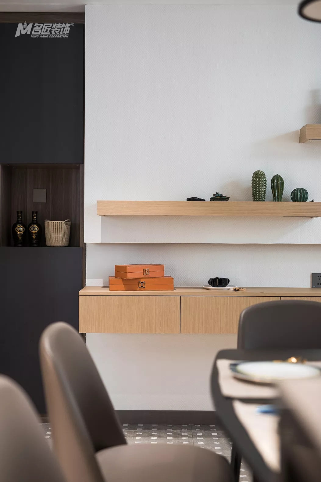 厨餐厅的另一端,墙面设计了木制隔板并装饰了一些小物品,为烹饪、就餐时光增添了不少情趣。